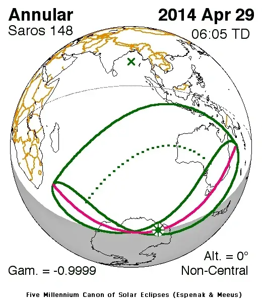 This annular solar eclipse is rare because the center of the Moon’s shadow- known as the antumbra- will miss the Earth entirely, while only the shadow edge will graze the planet over a small, D-shaped region of Antarctica. This rarity is called a ‘non-central annular eclipse’, and only 1.7% of the annular eclipses over the past 5000 years have earned this classification.